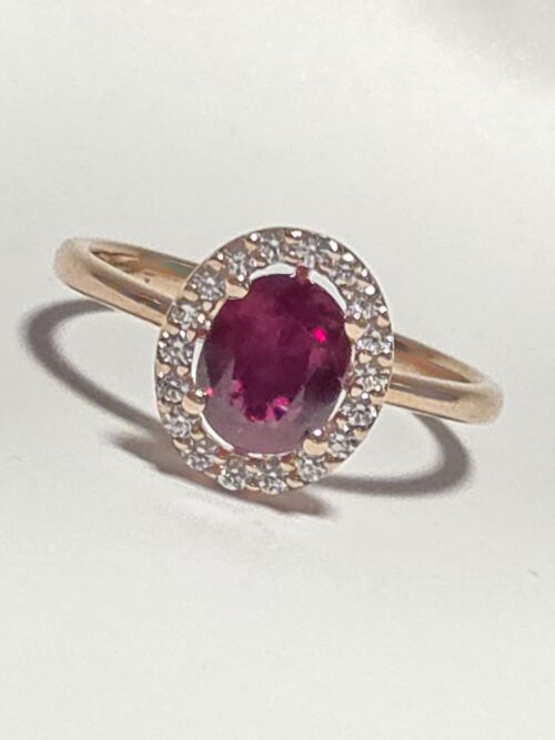 Anello oro rosa rubino con contorno di diamanti naturali